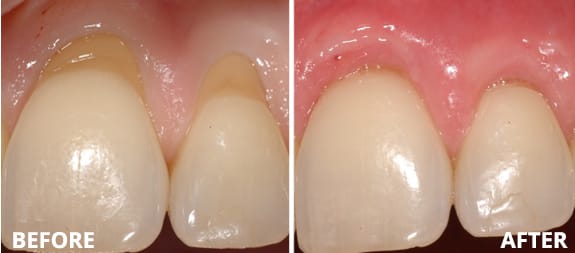Gingival recession can be the result of many different processes. It occurs when the gum pulls away from the tooth, resulting in root exposure. Recession can occur in individuals of all ages and can lead to root cavities, sensitivity, an unattractive smile and above all, TOOTH LOSS.